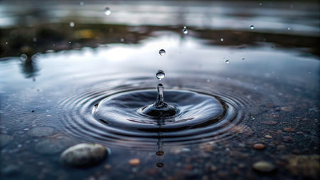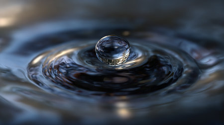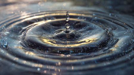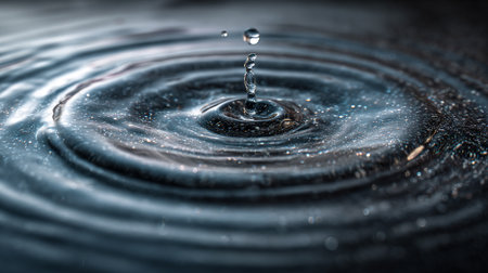 Water droplet creating ripples on a reflective surface, close-up view. Serenity and nature concept