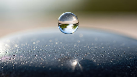 A drop of water is captured in a photograph, reflecting the light and creating a sense of calmness and serenity