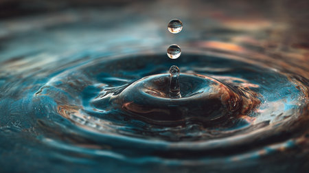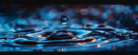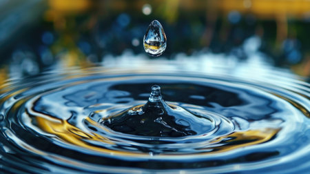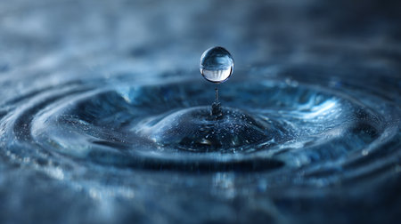 A water droplet impacts a dark blue surface, creating ripples and reflecting light in a serene setting.