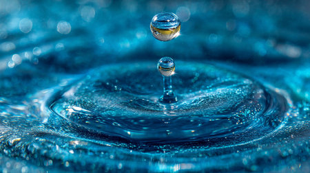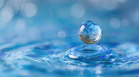 A close-up image captures a water droplet hovering over a rippling water surface. The droplet reflects light creating a bright, circular shape. The composition exhibits shades of blue, and the bokeh effect creates a soft background. This visual could be useful for projects related to hydration, natural elements, or conceptual themes.