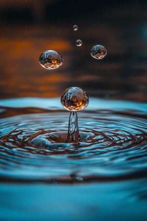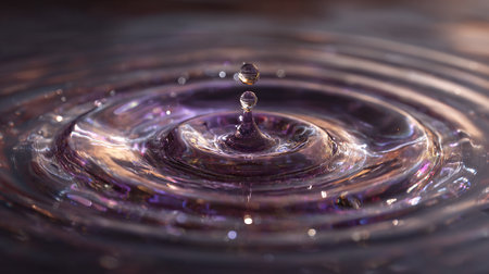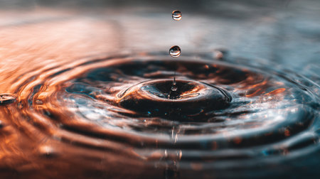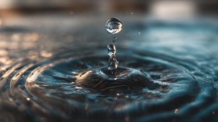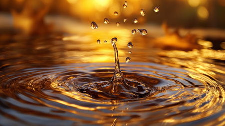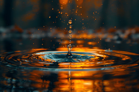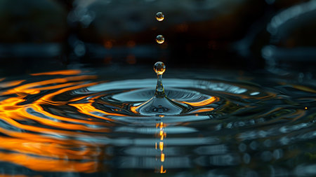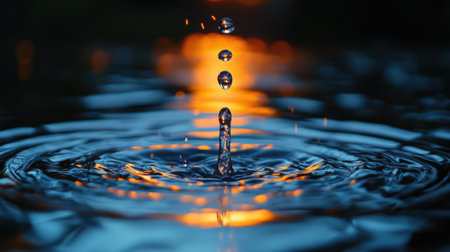 A stunning close-up of a water droplet creating ripples on a serene water surface during sunset. The mesmerizing beauty showcases natures fluid motion and tranquility.