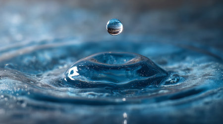 A close-up image showcases a water drop suspended above the surface, creating concentric ripples. The scene features shades of blue, and the lighting highlights the water's texture. This photograph could be utilized in various contexts such as advertising, educational material, or for artistic applications.