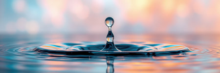 A single water droplet falls into still water creating a beautiful splash. The scene showcases vibrant colors of sunset reflecting on the surface offering a calm ambiance.