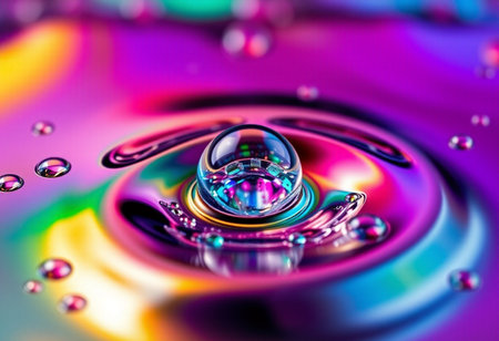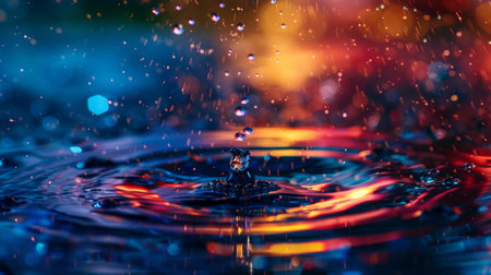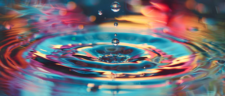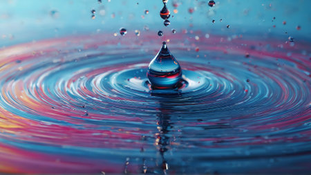 A water droplet creating ripples with colorful reflections. The vibrant and dynamic image is perfect for themes related to water, nature, and abstract photography.