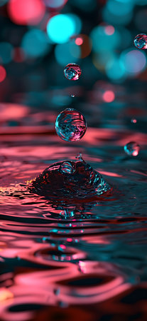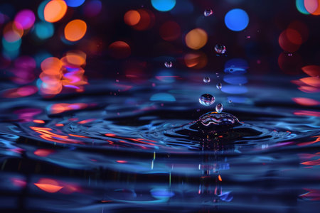 Water droplets fall and collide with a reflective surface, creating ripples as colorful bokeh lights shimmer in the background, adding to the enchanting nighttime atmosphere.