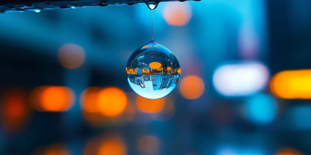 Bokeh City Lights Reflected in a Suspended Water Droplet, Abstract Urban Photography Background