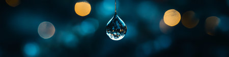 A Single, Reflective Water Droplet Hangs, Illuminated by Warm, Out-of-Focus Bokeh Lights