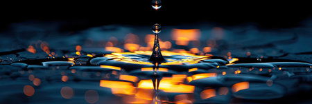 A mesmerizing close-up image of water splashing, featuring glowing droplets and beautiful ripples on a reflective surface, capturing the essence of motion and beauty.