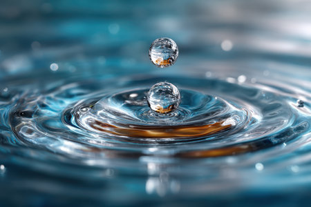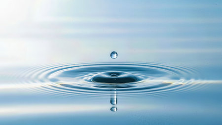 A pristine droplet hovers delicately above a serene blue surface, creating gentle ripples that embody peace and the subtle rhythm of nature's flow.