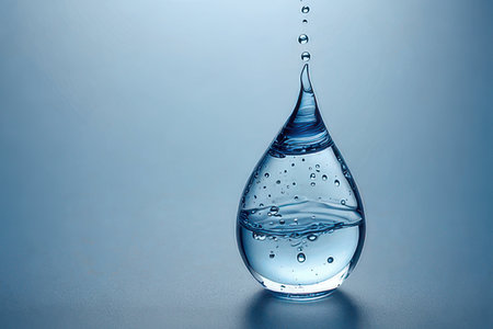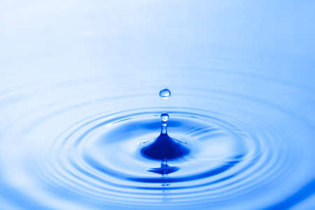Water drop falling into water with ripples on blue background