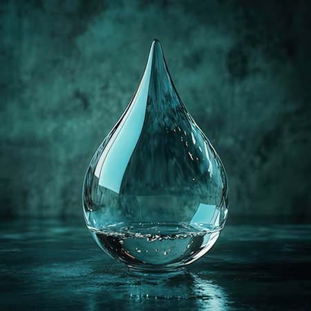 A water droplet impacts a dark blue surface, creating ripples and reflecting light in a serene setting.