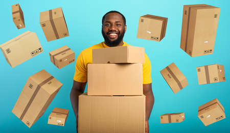 Happy boy receives a lot of packages from online shop order. Blue background.