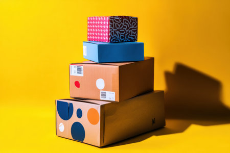 Brightly colored shipping boxes are stacked neatly, showing unique designs and patterns.