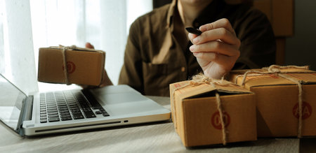 Business woman start up small business entrepreneur SME success .freelance woman working at home with Online Parcel delivery. SME and packaging deliveryconcept
