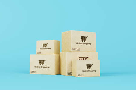 Online shopping concept. Web or mobile application ecommerce. Carton paper box on blue background. 3d rendering