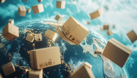 Futuristic global delivery concept featuring cardboard boxes soaring around the earth in logistics