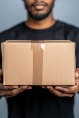 A person stands against a white background holding a delivery package with both hands. The package is securely wrapped and ready for delivery.