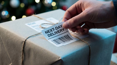 A hand carefully attaches a 'NEXT-DAY DELIVERY' label, complete with a barcode, to a package. The parcel is wrapped in brown paper and tied with twine, set against a blurred background of colorful,.
