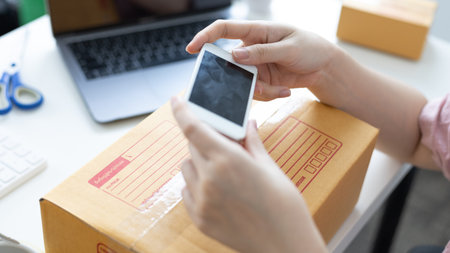 Young woman taking a photo of a box postbox with a mobile phone or Selfie, Identity verification or order confirmation, New business style for young people working at home, Sell online concept.