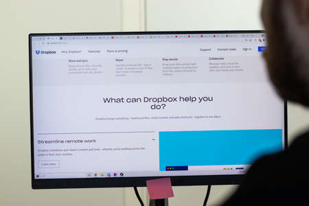 New York, USA - 26 April 2021: Dropbox website page on screen, man using service, Illustrative Editorial