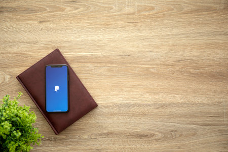 Alushta, Russia - August 26, 2018: iPhone X with service PayPal on the screen and background wooden desk. iPhone 10 was created and developed by the Apple inc.