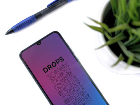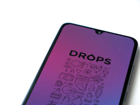 Lod, Israel - July 8, 2020: Drops - Language learning app launch screen with logo on the display of a black mobile smartphone isolated on white background. Top view flat lay with copy space.