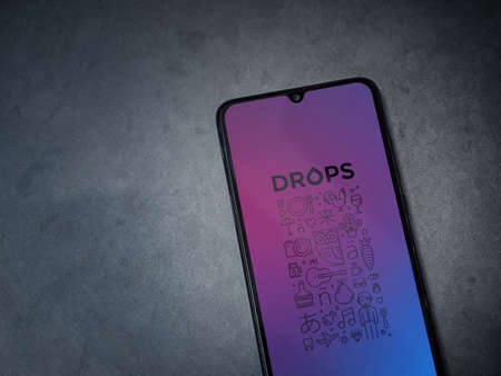 Lod, Israel - July 8, 2020: Drops - Language learning app launch screen with logo on the display of a black mobile smartphone on a dark marble stone background. Top view flat lay with copy space.