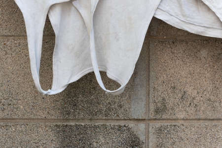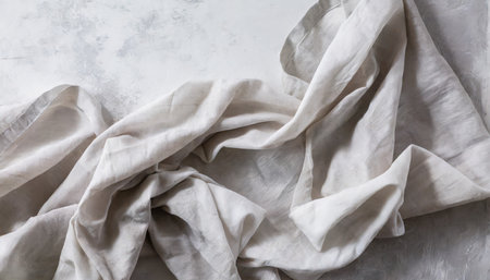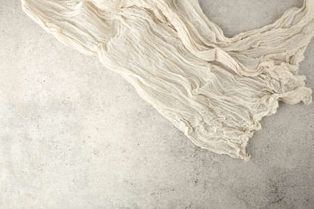 Wrinkled gauze fabric on light grunge stone background. Cotton gauze fabric cloth on stone tile surface with copy space.