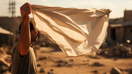 White fabric draped on rustic wooden table, minimalistic still life. Artistic home decor concept