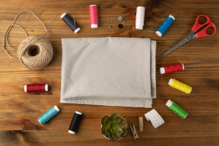 Sewing mockup with accessories for tailoring on wood table flat lay. Seamstress vintage mock up background, saw supplies with copy space. Hand made embroidery design, tailor tools border top view