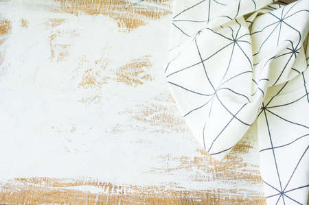 Kitchen towel or napkin over the rustic wooden table. View from above with copy space