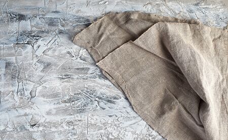 white textile kitchen napkin on gray cement background, copy space