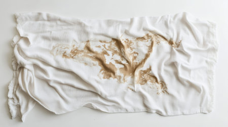 White kitchen towel with a distinct coffee stain, isolated on a neutral background