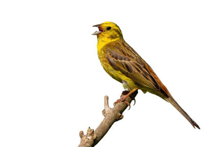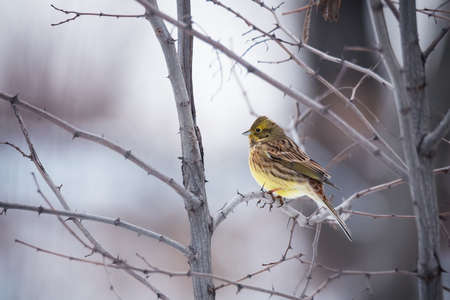Small Yellowhammer or bunting bird sitting on tree branch on grey nature background
