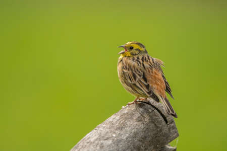 Yellowhammer (Emberiza citrinella). A singing bird on a beautiful green background. In the woods. Ukraine