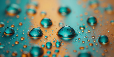 AI Generated. Water Droplets on Teal and Amber Surface A Close up View