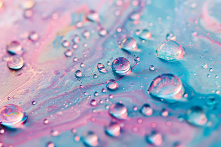 This image features vibrant gel droplets resting on a smooth surface, reflecting light in a soft pink and purple background, creating an ethereal atmosphere.