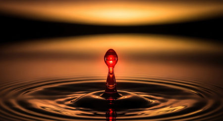 A droplet of water strikes a tranquil surface, causing ripples and capturing the soft evening light.