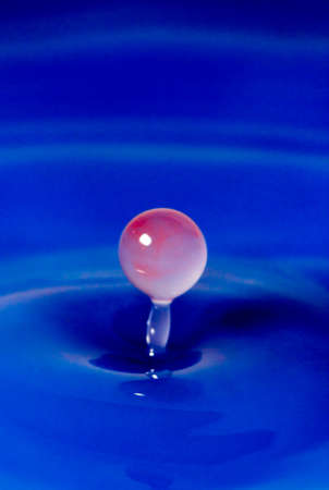 A red drop drips into the water and creates splashes of different shapes, due to the splashes waves are created on the water, the concept of a liquid splash, the substance is painted pink