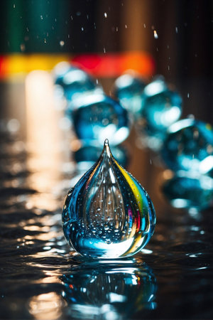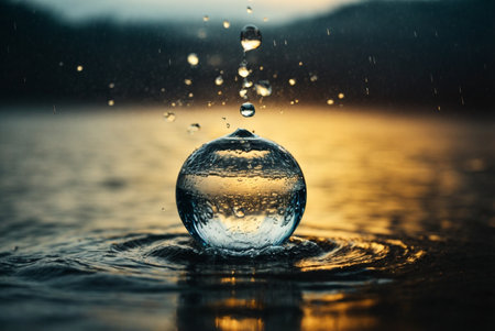 Transparent water droplets suspended in the air reveal nature's beauty and intricate details, perfect for illustrating the essence of water and its essential role.