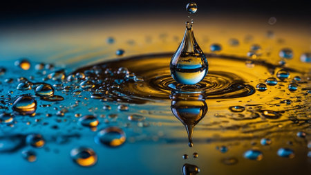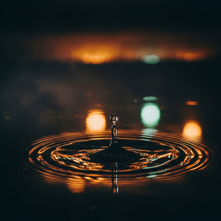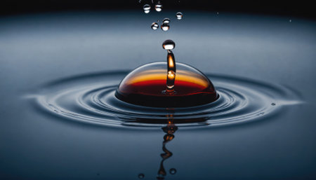 A water droplet impacts a dark blue surface, creating ripples and reflecting light in a serene setting.