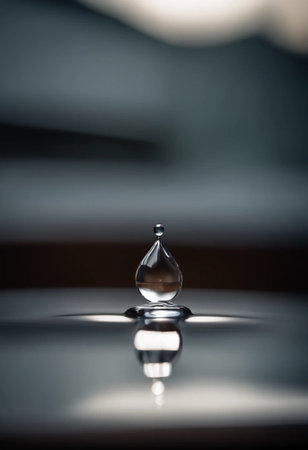 A single, perfectly formed droplet of water hangs suspended in time, a crystal sphere reflecting the world before it makes its impact. Below, concentric ripples spread outward, marking the moment of contact, a symbol of purity, clarity, and the profound effect of a single action.