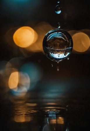 This stunning image captures a water droplet poised on the surface, reflecting vibrant city lights with a bokeh effect, creating a serene and artistic visual experience.