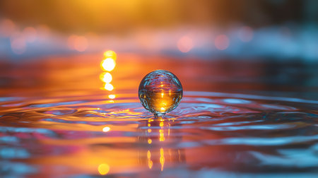 A water droplet creates a crown splash, captured in macro photography against a sunset backdrop. The image displays a symmetrical composition, reflecting the sunlight in the water. This photo could be used for various commercial projects related to nature, science, or artistic designs.