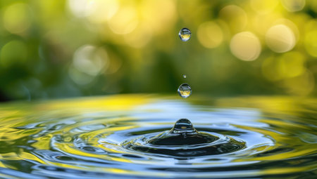 AI Generated. A macro view of water droplets creating ripples on a natural water surface
