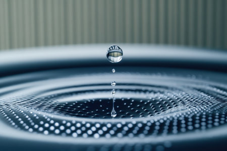 Close-up macro photography of a serene and pristine water droplet impact creating ripples and concentric patterns. Captured in high-speed fluid dynamics