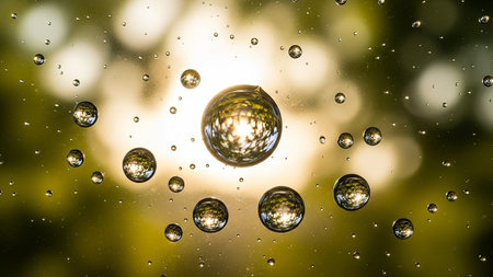 Effect showing macro view of water droplets on glass reflecting sunlight and green foliage in a bokeh effect. resolution
