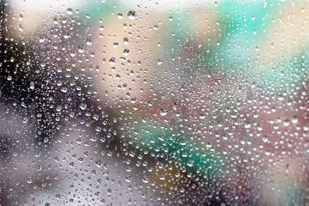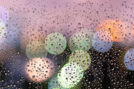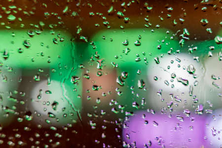Rain drop on glass window in monsoon season with colorful bokeh light from city buildings background.