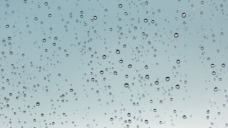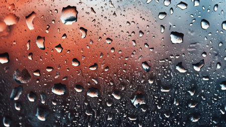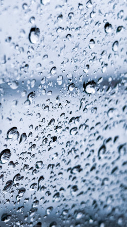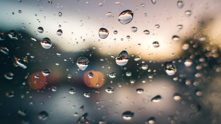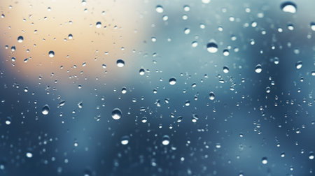 Raindrops on a glass window with a blurred background, capturing a tranquil and soothing mood.