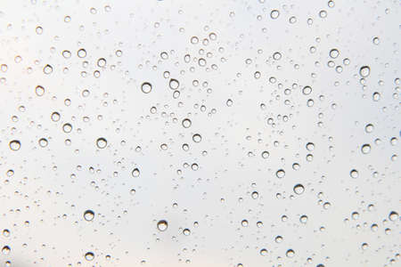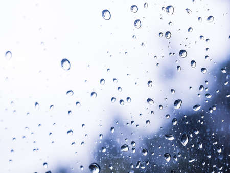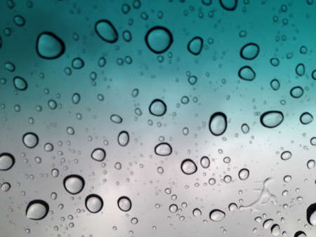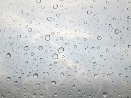 close up drops of rain on glass background. sky and cloud out of focus